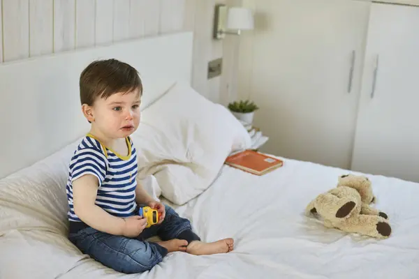 Triste Bebe Garcon Assis Sur Lit Tenant Voiture Jouet Regardant Loin 12 A 15 Mois Un Seul Petit Garcon Stock Photo